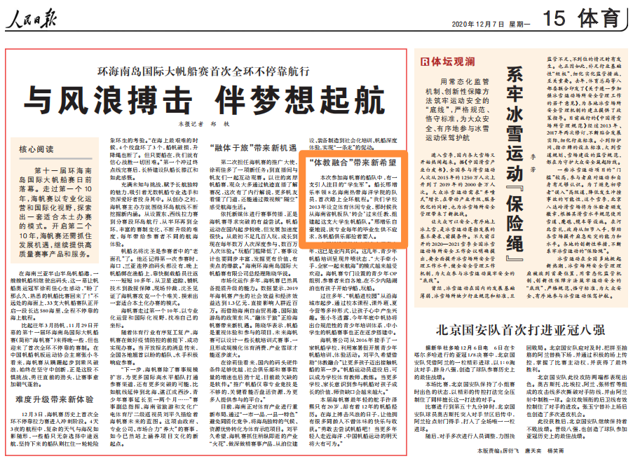 体教融合,育人为本。贯彻落实国家体育总局和教育部联合印发《关于深化体教融合促进青少年健康发展的意见》,我校不断加强学校体育工作、完善学生体育竞赛体系,全方位推动深化体教融合,促进学生全面健康成长。《人民日报》第26448期体育板块报道环海南岛帆船赛的专题中,对我校“体教融合”的案例做了专门报道。