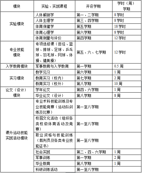 实践教学是本专业教学计划中不可或缺的重要教学环节,是本专业人才培养模式创新的重要研究项目,也是有效促进本专业学生从理论知识和运动技能向实践能力转换、达到专业人才培养目标的重要实践性环节。